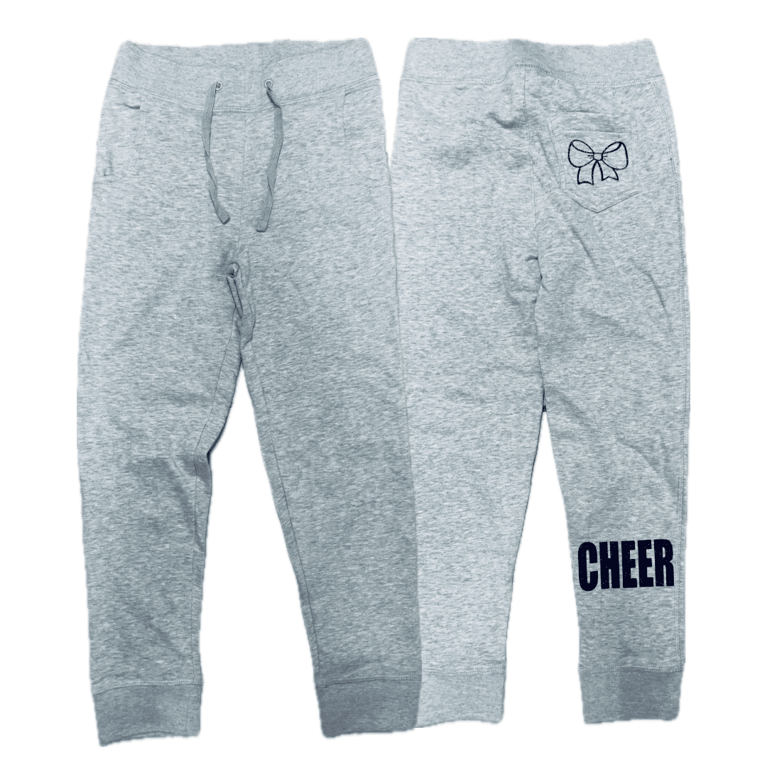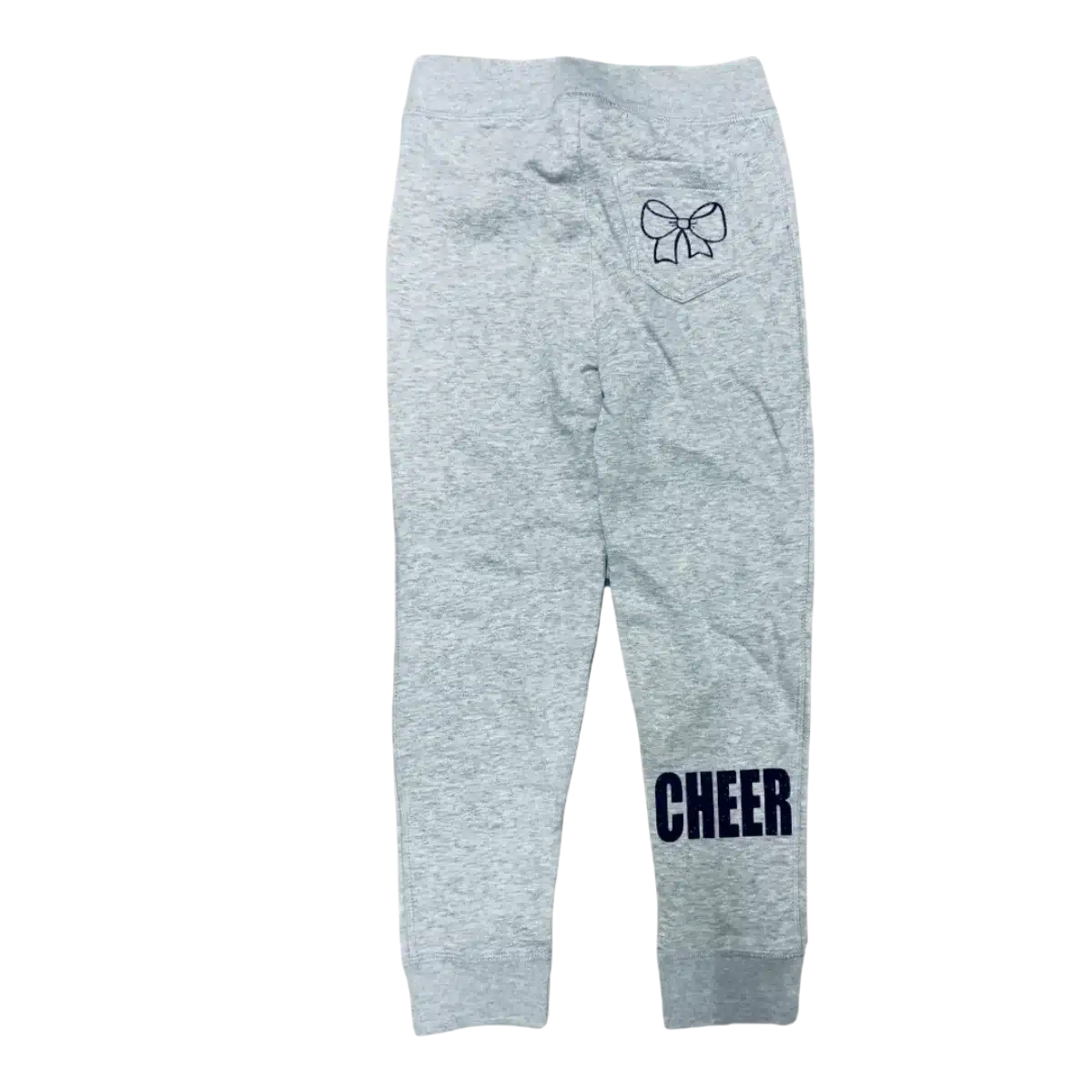 Grå joggingbukser med sort glitter tekst “Cheer” bagpå og en sløjfe på lommen.